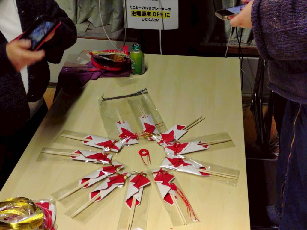 完成した水引は、箸袋に結ぶだけでなく、おせち料理の飾りとして使うなど、さまざまなアレンジができることも教えていただきました。